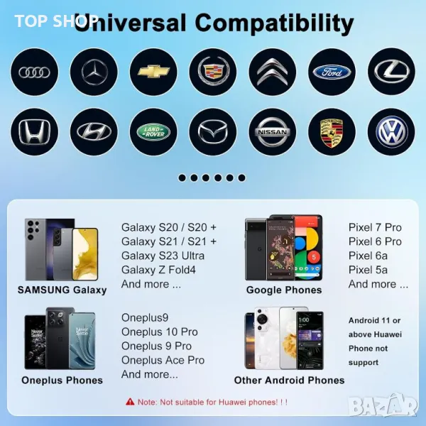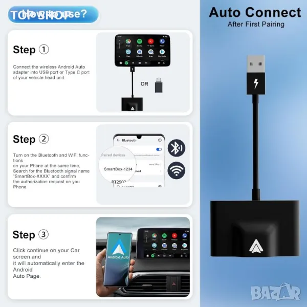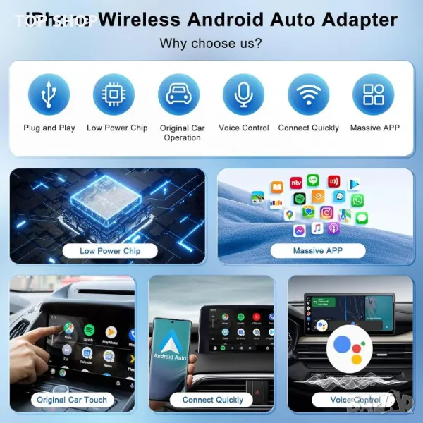 Безжичният Android Auto Adapter свързва вашия телефон безпроблемно след първоначалната настройка и стартира автоматично с двигателя на вашия автомобил, елиминирайки необходимостта от ръчно свързване на вашия телефон. Отличава се с компактен, преносим дизайн и ефективно разсейване на топлината за издръжливост и стабилност. Адаптерът поддържа гласово управление, управление от волана и работа с бутони, което ви позволява да използвате карти, да слушате музика, да провеждате разговори и да изпращате съобщения безопасно, докато шофирате. Той е универсално съвместим с повечето модели автомобили 2018-2024 г., оборудвани с кабелен Android Auto, поддържащи Android 11.0, но не и iPhone.