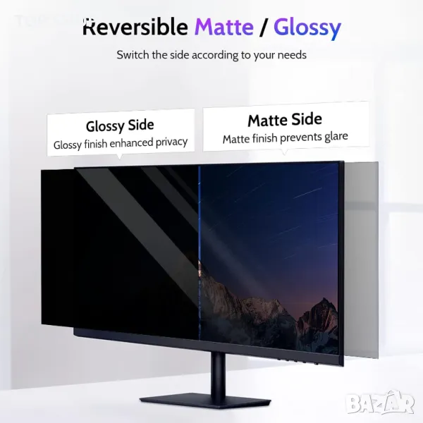 IPROKKO Dark Blackout 21,5-инчов екранен филтър за поверителност е проектиран да пасва на различни 21,5" компютърни монитори, съвместими с популярни марки като HP, Dell, Acer, Asus, Samsung, Lenovo и ViewSonic. С размери на ширина: 18 3/4" (477 mm), Височина: 10 9/16" (268 mm), и Диагонал: 21,5" (546.1 mm), предлага съотношение на страните 16:9, с изключение на повдигнатата рамка. Екранът подобрява поверителността, като използва първокласни японски PET материали и усъвършенствана оптична технология от 4-то поколение, осигуряваща качество на картината с висока разделителна способност и ъгъл против надникване от около 30°-60°. Той предлага обратими матирани/гланцови повърхности за намаляване на отблясъците и филтриране на синята светлина, лесно може да се монтира или с неподвижни залепващи ленти, или с подвижни плъзгащи се пластини. Екранът може да се мие и е устойчив на надраскване, което го прави идеален за обществени места.