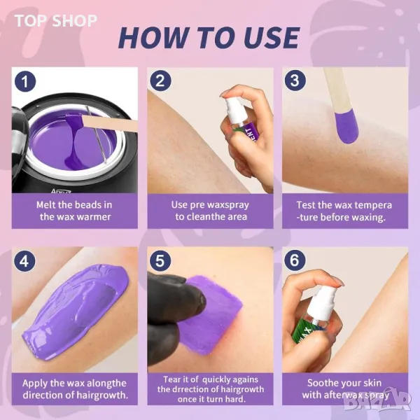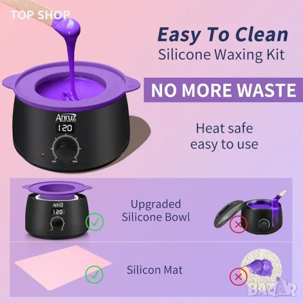Комплектът за твърд восък ANRUZ разполага с прецизен контрол на температурата с LED дисплей, бързо топене на 100 g восъчни перли за 12-15 минути и поддържане на постоянна температура за ефективно нанасяне на восък. Комплектът включва машина за кола маска от 500 ml, силиконова купа и постелка, 400 g перли за кола маска, 30 стикчета за кола маска с различни размери, 30 аксесоара за кола маска за нос и е в състояние да премахне до 97,53% от нежеланото окосмяване по тялото. Неговите силиконови компоненти са безопасни при топлина, незалепващи и за многократна употреба, опростявайки почистването и предотвратявайки разливане на восък.