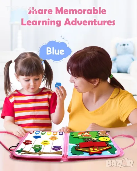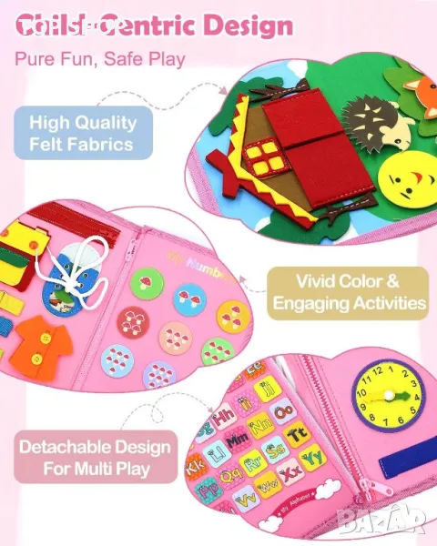 Моля използвайте системата за съобщения! Просто изпратете запитване. По телефона се губи време за уточняването на търсения от Вас продукт.Образователна чанта, в която всяка страница е пълна с над 20 завладяващи дейности, които не само забавляват, но и насърчават развитието на когнитивните и двигателните умения. Азбука, броене, разпознаване на цветове до пъзели за решаване на проблеми и умения за обличане, това е цялостен инструмент за обучение. Изработена е от мека филцова материя без бисфенол-А, без остри ръбове, здрава, издръжлива и безопасна за детето. Компактна и лека, подходяща за възраст 2-4 години.