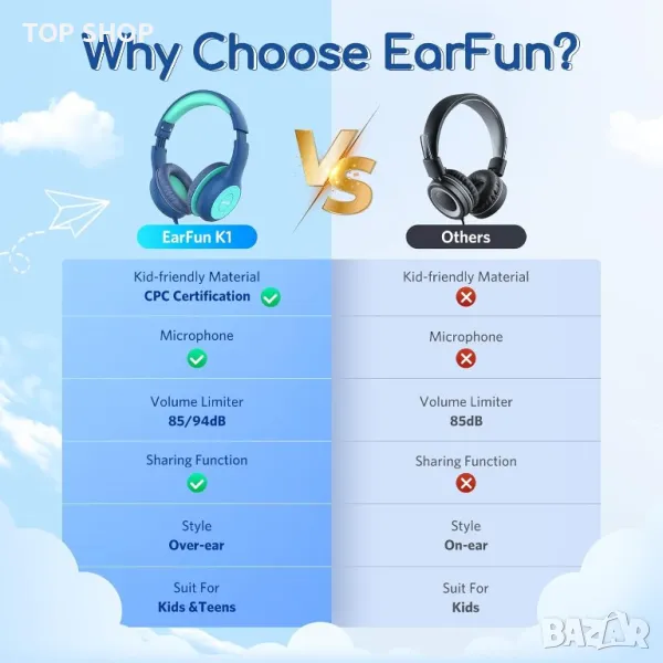 Моля използвайте системата за съобщения! Просто изпратете запитване. По телефона се губи време за уточняването на търсения от Вас продукт.Детски слушалки EarFun: Изработени от подходящи за деца, устойчиви материали, тези слушалки се придържат към стандартите CPC и CPSIA, осигуряващи безопасна среда за слушане, ограничена до 85dB/94dB, за да предпазят ушите на младите хора. Тяхната найлонова оплетка без оплитане осигурява издръжливост срещу усукване и изпускане. Потопете се в балансиран стерео звук, благодарение на 40-милиметровите драйвери, предлагащи динамичен диапазон и живи баси. Вграден HD микрофон подпомага онлайн обучението и разговорите с лесни контроли за избор на песни и разговори. Уникален е 3,5 мм порт за споделяне, позволяващ споделяне на аудио без сплитери. Проектирани за комфорт, меките капачки за уши и регулируемите плъзгачи гарантират плътно прилягане, докато сгъваемият дизайн предлага преносимост. Слушалките EarFun са идеалният спътник за учене и игра на детето.