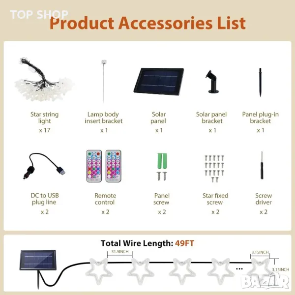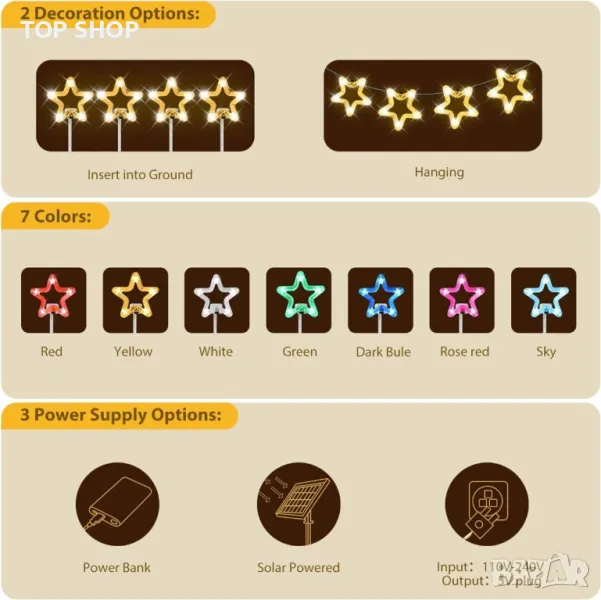 Освежете пространството си с тази универсална звездна лампа, подходяща за окачване или поставяне в земята, идеална за всяко време с водоустойчивия си дизайн. Отличаващ се със светодиоди с висока яркост, покрити от издръжлива звездна обвивка, той предлага осем регулируеми цвята и различни режими на мигане, за да отговарят на всеки повод, гарантирайки, че вашата градина или палатка остава жизнена и добре осветена. Със стъклен ламинат, покриващ слънчевия панел, тази светлина може да се похвали с по-висока пропускливост, подобрена ефективност на зареждане и дълготрайност в сравнение със своите събратя. Основно се захранва от слънчева енергия, включва се автоматично при здрач и се изключва на разсъмване, но също така предлага USB захранване за непрекъснато осветление по време на дъждовни дни или за използване на закрито.