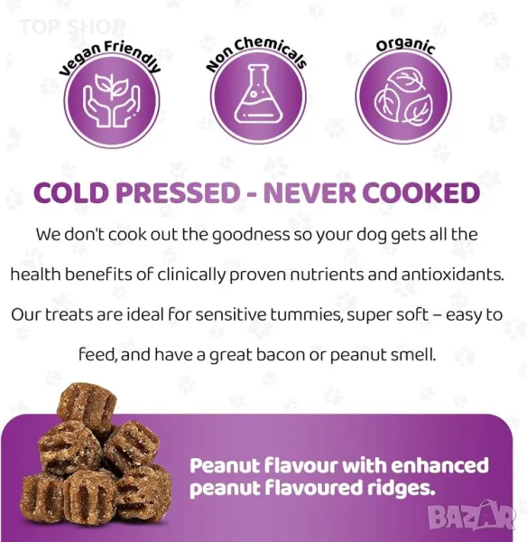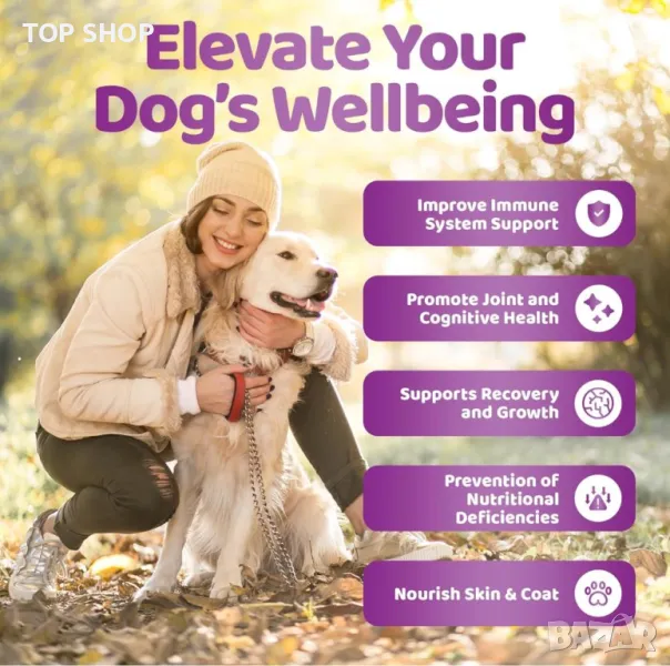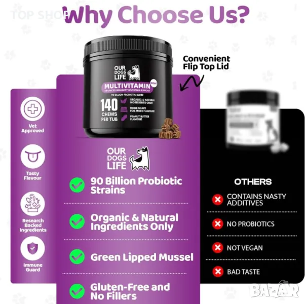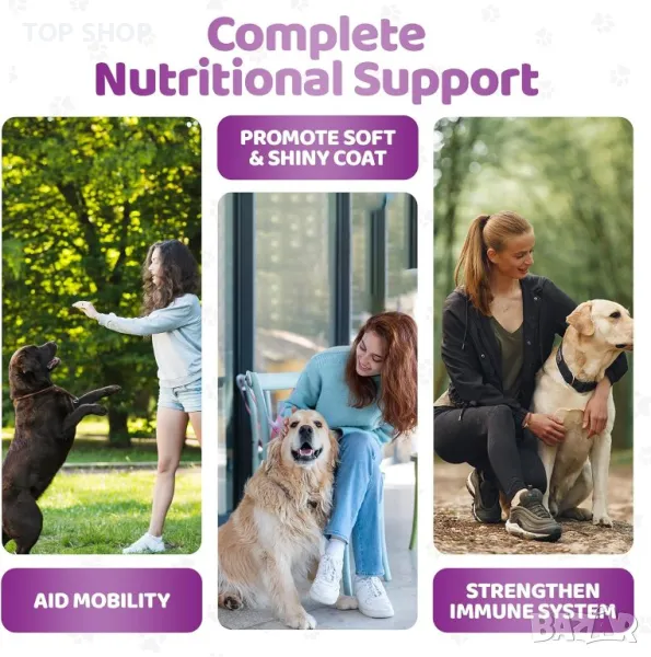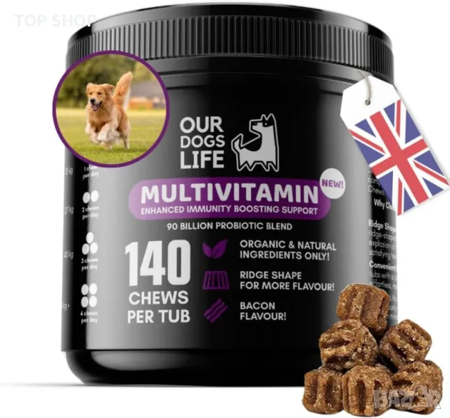 Моля използвайте системата за съобщения! Просто изпратете запитване. По телефона се губи време за уточняването на търсения от Вас продукт.Тази опаковка от 140 дъвчащи продукти комбинира основни витамини и добавки за кучета, включително органичен коралов калций, зеленоуста мида и морски водорасли, за повишаване на цялостната жизненост. Богатата на хранителни вещества формула с биотин, витамин B6 и D3 поддържа козината, ставите и имунната система на вашия домашен любимец. Добавени са пробиотици за здраве на храносмилането и балансирана чревна флора, подобрявайки усвояването на хранителни вещества. Направени от първокласни натурални съставки като кокосово масло и бери Кона, нашите витамини за кучета са безопасни и ефективни, предназначени за кучета от всякакъв размер и порода. Тези добавки имат за цел да увеличат жизнеността и енергията на вашето куче, насърчавайки активен и здравословен начин на живот.