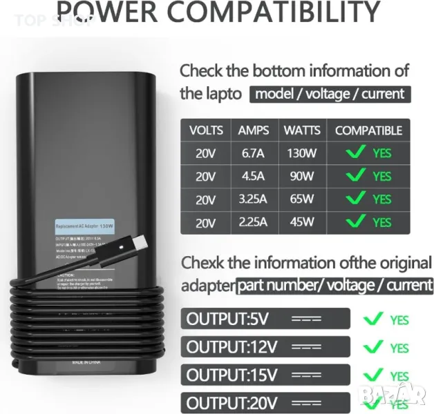 Обща мощност: 130 W зарядно устройство за лаптоп (съвместимо със зарядно устройство Dell 90 W USB C, зарядно устройство Dell 65 W USB C). Вход: 100-240 V-50-60 Hz; Изход: 5V/20V-1A/6.5A 130W; Размер на конектора: USB C тип C