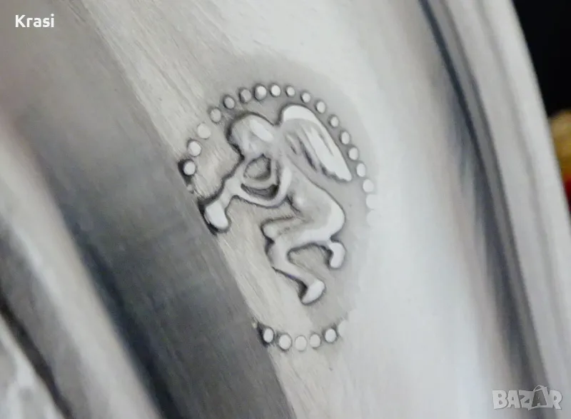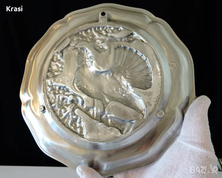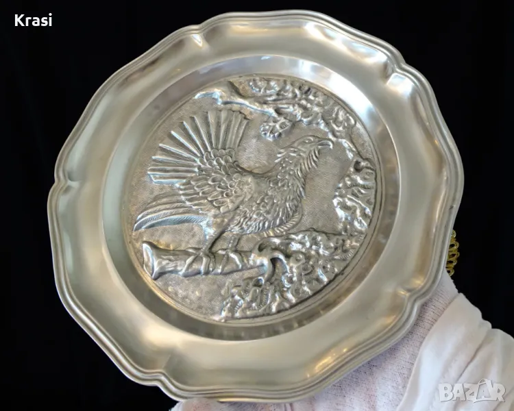Западно германска чиния за стена,пано,майсторска ръчна изработка от 95% калай и 5% сребро.Маркирана от производителя.В центъра има прецизна релефна картина на Глухар в гората,ловна картина.Високо качество със сребърен блясък.Има окачалка за стена.Диаметър 22.5 см.,височина 2 см.,тегло 300 гр.