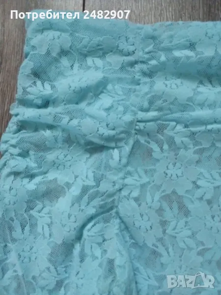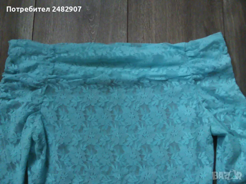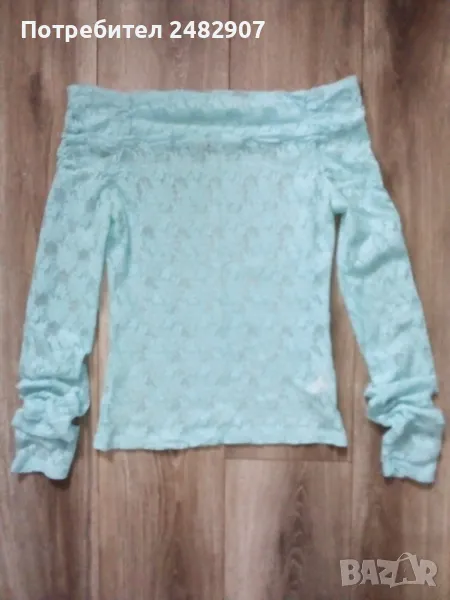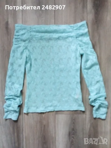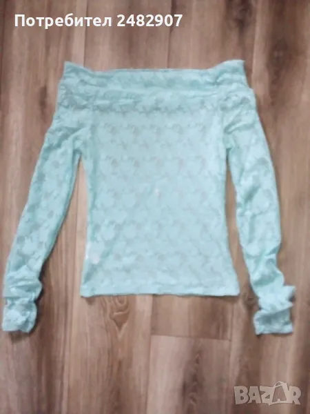 Дантелена дамска блуза, цвят резеда с дълъг ръкав и голи рамене. Съдържа 100 % найлон. Ширина в раменете - 44 см, ширина под мишниците - 39 см, ширина в долната част - 40 см, дължина от рамото до долу - 53 см, дължина на ръкава от рамото - 80 см, ширина на ръкава в долната част - 10 см. Много запазена, почти не е използвана.