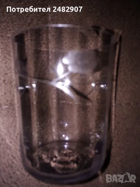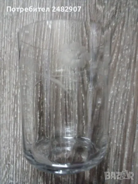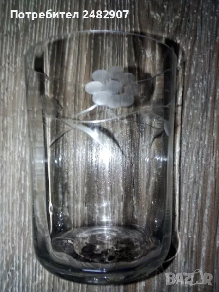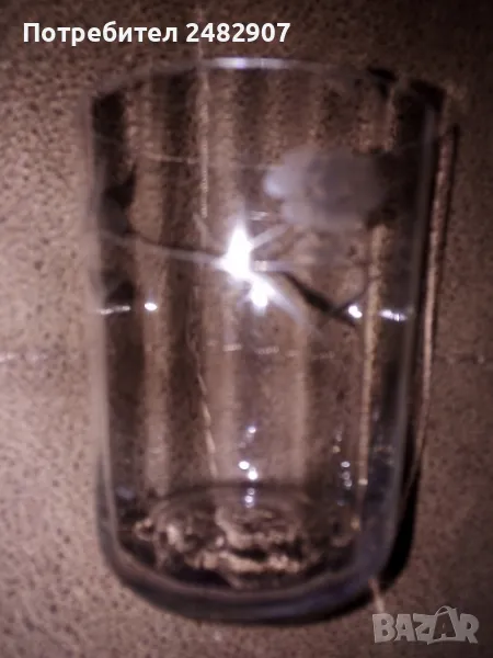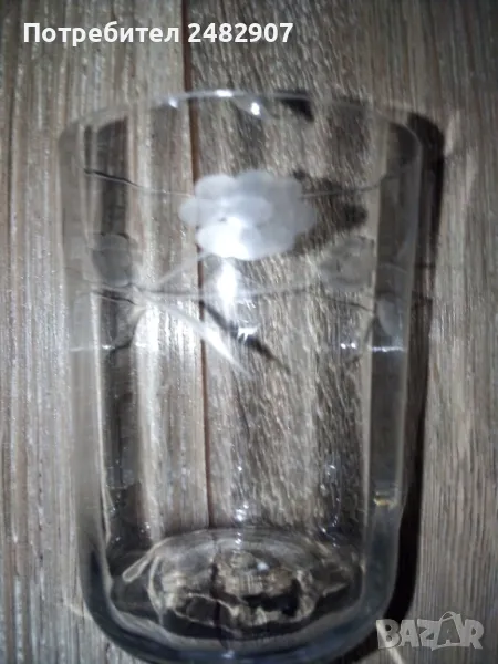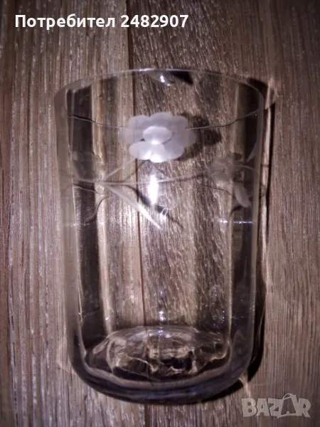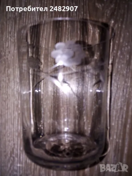 Стара стъклена тънкостенна чаша с гравирани цветя. Диаметър в долната част - 5,5 см, диаметър в горната част - 6,5 см, височина - 8,5 см. Много запазена, почти не е използвана, със забележка, видима от снимките. Подходяща за колекция.