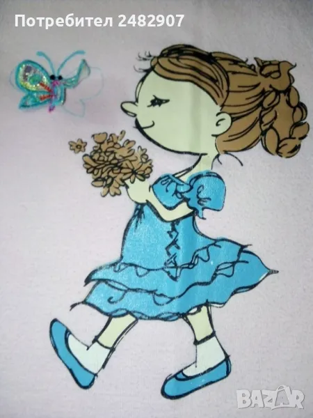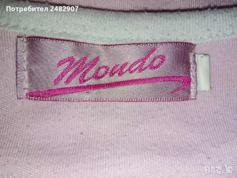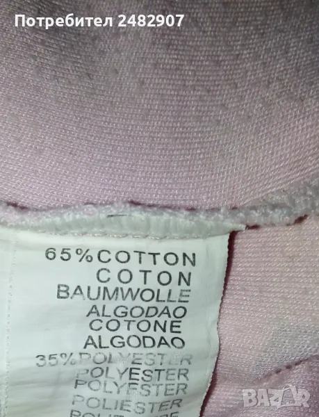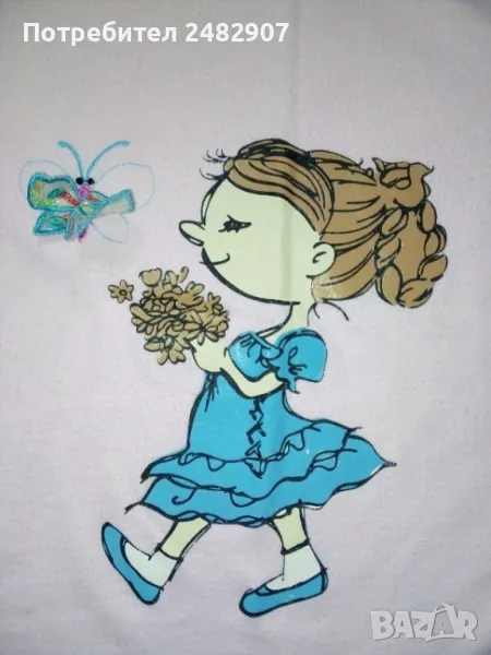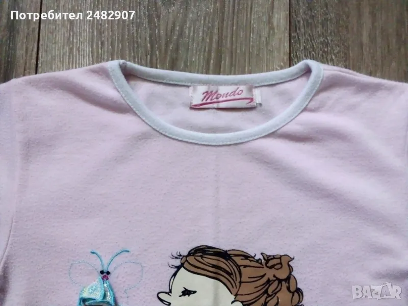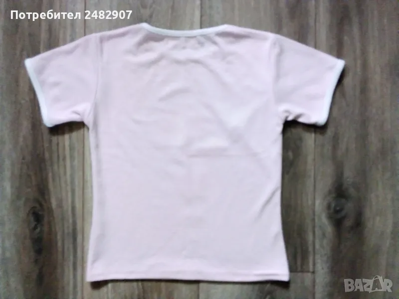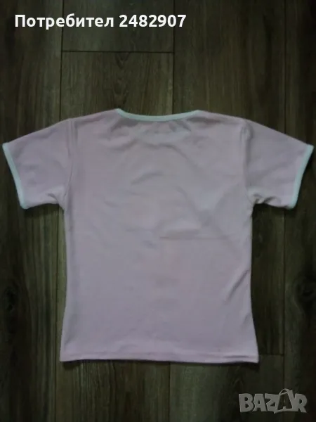 Детска розова тениска с щампа. Съдържа 65 % памук и 35 % полиестер. Ширина в раменете - 30 см, ширина под мишниците - 34 см, ширина в долната част - 35 см, дължина от рамото до долу - 44 см, дължина на ръкава от рамото - 13 см, ширина на ръкава в долната част - 13 см. Много запазена, почти не е използвана.