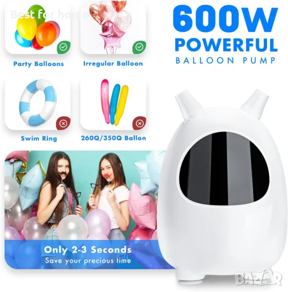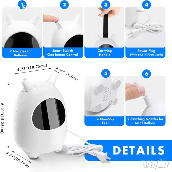 【ЗАБЕЛЕЖКА】ТОЗИ АРТИКУЛ САМО ВЪЗДУШНА ПОМПА, НЕ ХЕЛИЙ !!! Тази електрическа помпа за балони е съвместима с всички видове кръгли балони, с изключение на дългите, усукани, анимационни балони и имайте предвид, че тя пълни балоните само с въздух, а не с хелий или водород.