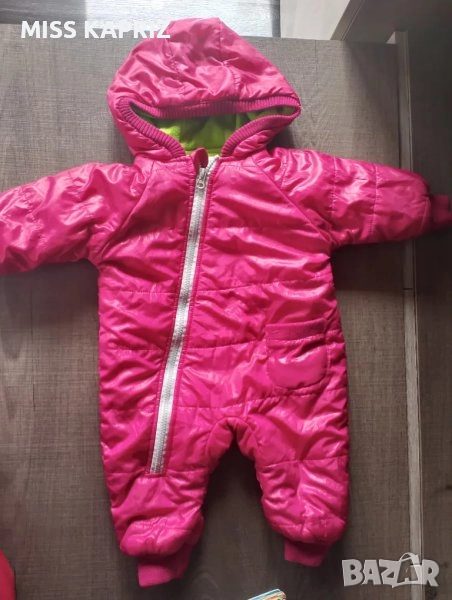 Бебешки розов космонавт за момиче 6-9м,с поларена подплата и страничен цип, ластични маншети на ръкавите и крачола,малък джоб, шушлякова материя
