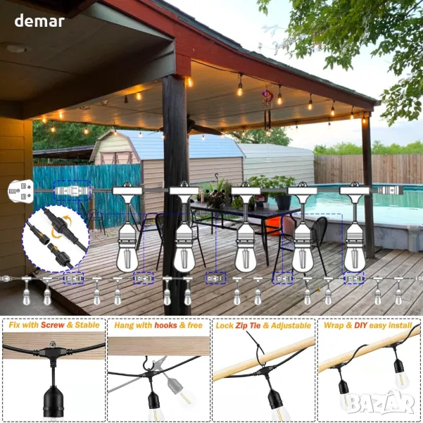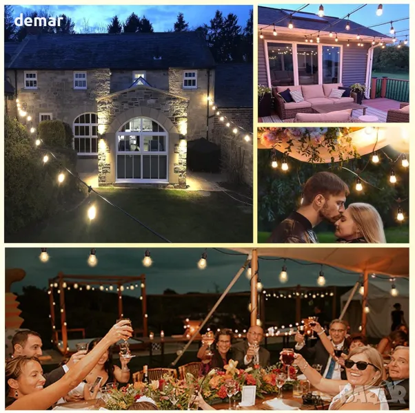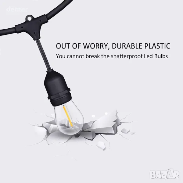 Устойчиви на разбиване и водоустойчиви 8M външни светлини с издръжливи пластмасови LED крушки и здрав PVC кабел, проектирани да издържат на екстремни метеорологични условия. Лесни за инсталиране с вградена примка за окачване, тези енергоспестяващи лампи използват 7x1W LED крушки, осигуряващи по-ярко осветление, като същевременно консумират по-малко енергия от традиционните лампи с нажежаема жичка. Излъчвайки топла светлина от 2700K, те създават уютна атмосфера, а яркостта може да се регулира със съвместим димер (не е включен).