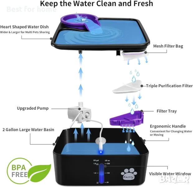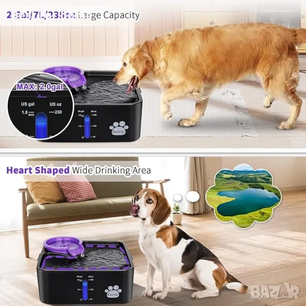 【Голям капацитет от 230 унции/1,8 галона и напълно широка площ за пиене】 Големият капацитет от 230 унции/1,8 галона прави този фонтан за домашни любимци идеален за всички породи кучета, котки и домашни любимци, намалява честотата на зареждане вместо вас, като същевременно осигурява ежедневните нужди от вода на вашите бебета. Кръглият извор и уникалната чиния с форма на сърце правят този фонтан за вода за кучета абсолютно широка зона за пиене, насърчавайки вашите домашни любимци да бъдат щастливи, споделяйки вода от всички страни едновременно.