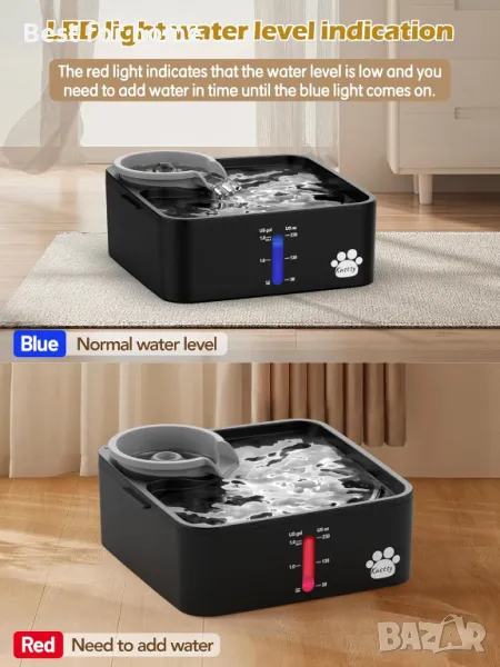 【Прозорец за котлен камък и светодиодно напомняне за недостиг на вода】С ясното прозорче за нивото на водата и светодиодното напомняне за недостиг (светодиодната светлина се превръща от синьо в червено при липса на вода), можете да замените вашия домашен любимец с прясна вода навреме без никакви проблеми. Освен това има капацитет за съхранение на вода от около 470 ml, който може да осигури вода за вашия домашен любимец в случай на прекъсване на тока.