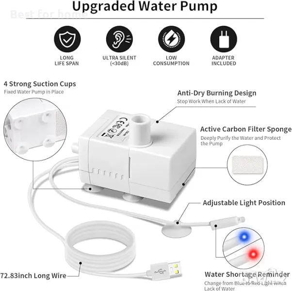 【Материал без BPA и безопасна интелигентна помпа】 Всички части на този диспенсър за вода за домашни любимци са изработени от висококачествена хранителна ABS смола, без BPA, здрави, хигиенични, издръжливи и лесни за почистване. Помпата е ултра тиха (под 30 dB) и има ниска консумация на енергия + дизайн против сухо изгаряне, което осигурява на вашите домашни любимци 100% безопасност при пиене.