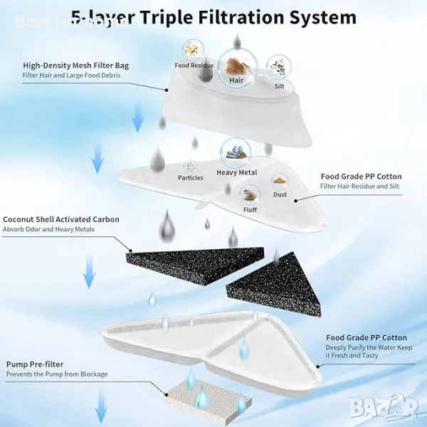 【Тройна филтрация и уникална торбичка с предварителен филтър】Автоматичен воден фонтан за кучета Kastty използва висок клас филтър с активен въглен от черупки на кокосов орех, за да осигури най-силната филтрируемост за улавяне на всичко (коси, тежки метали, дори невидимото) и безопасността при пиене на вашите бебета с козина, тъй като памучният слой PP и въгленът са подходящи за храна. Нещо повече, тази поилка за домашни любимци е с добавена предфилтърна торба, която ефективно събира косми и остатъци от храна за по-чиста вода и по-чист съд.