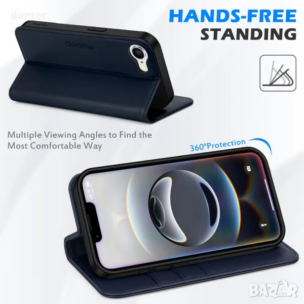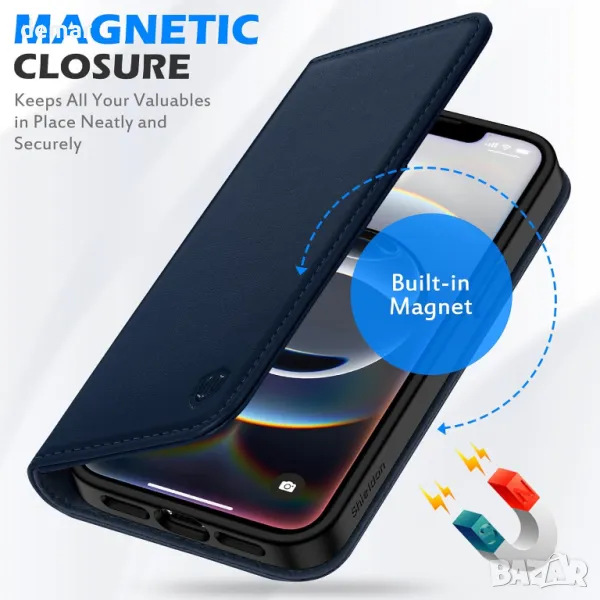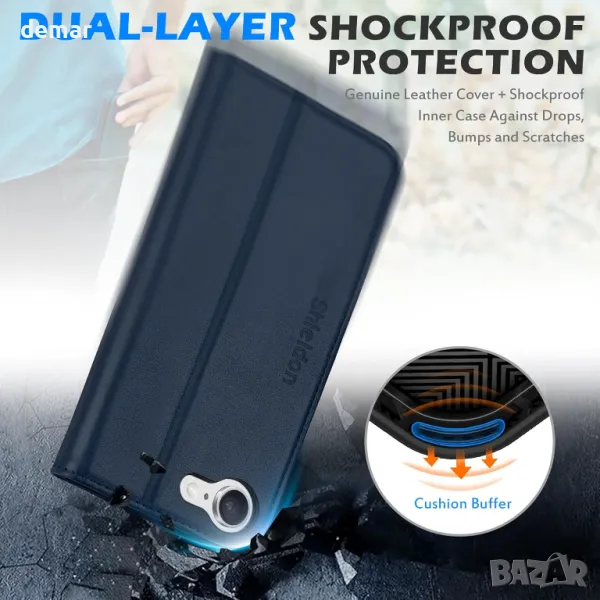 Калъф SHIELDON за iPhone 16e 6.1" 5G 2025, флип калъф от естествена кожа - тъмносин