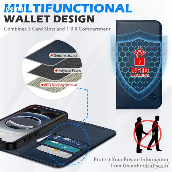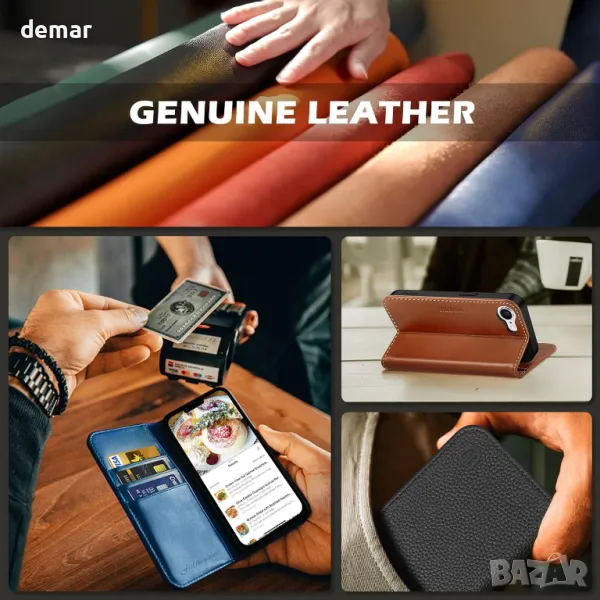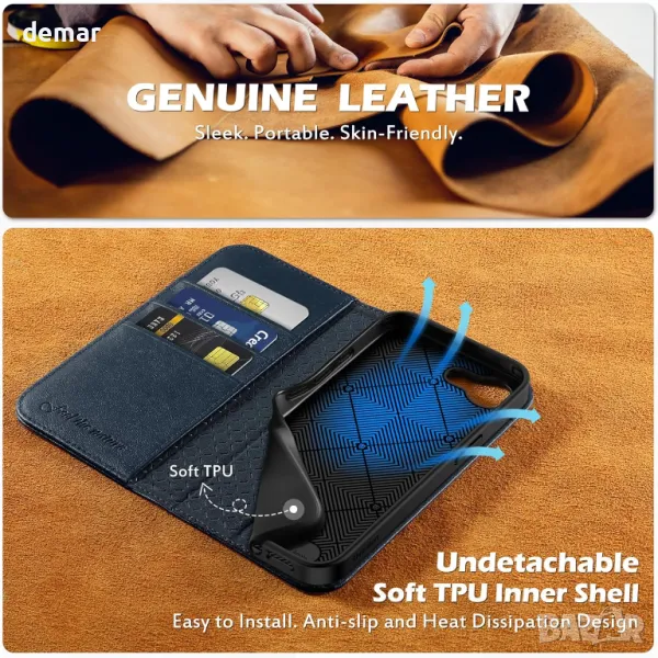 Проектиран ексклузивно за iPhone 16e 5G (6,1-инчов, издание 2025 г.), този калъф - портфейл от естествена кожа предлага първокласно усещане с вдъхновен от винтидж външен вид, който развива богата патина с течение на времето. Разполага с три слота за карти и отделение за пари, което замества нуждата от обемист портфейл. Усъвършенстваната RFID блокираща технология защитава личните данни, докато удароустойчивата TPU вътрешна обвивка и повдигнатите ръбове предпазват телефона от изпускане, надраскване и удари. Вградената невидима стойка осигурява гледане без ръце, а магнитното затваряне държи всичко сигурно. Прецизните изрези осигуряват лесен достъп до всички портове и функции. Забележка: Претоварването на карти може да отслаби магнитното затваряне.