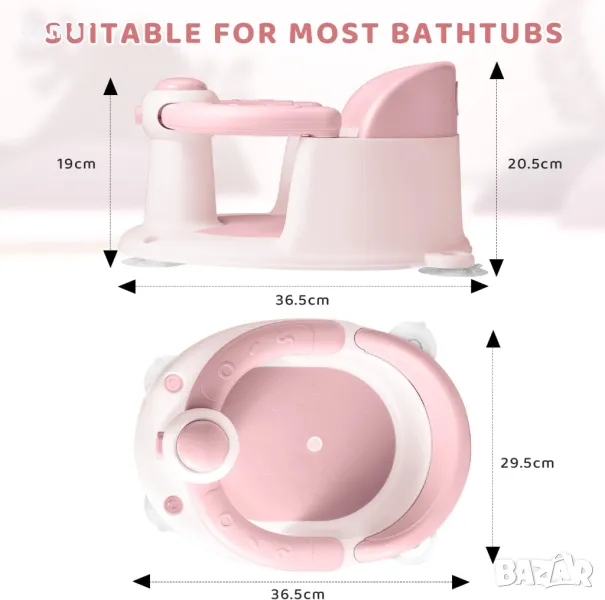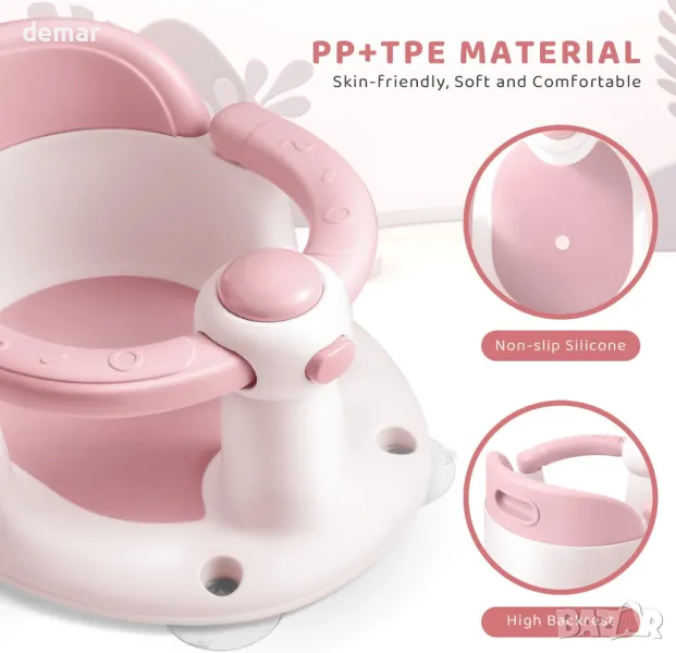 Тази бебешка седалка за баня разполага с отваряем подлакътник за лесен достъп, 360° съраунд дизайн с повдигната облегалка за гръбначна опора и четири вендузи против хлъзгане за стабилност. Изработена от нетоксични, щадящи кожата материали, тя осигурява безопасност и комфорт. Подходящо за бебета на 6 месеца и повече, освобождава ръцете на родителите по време на къпане и е прекрасен подарък за нови родители или специални поводи.