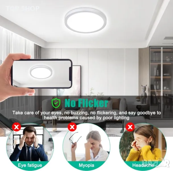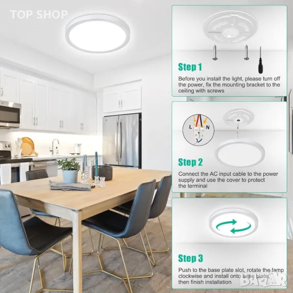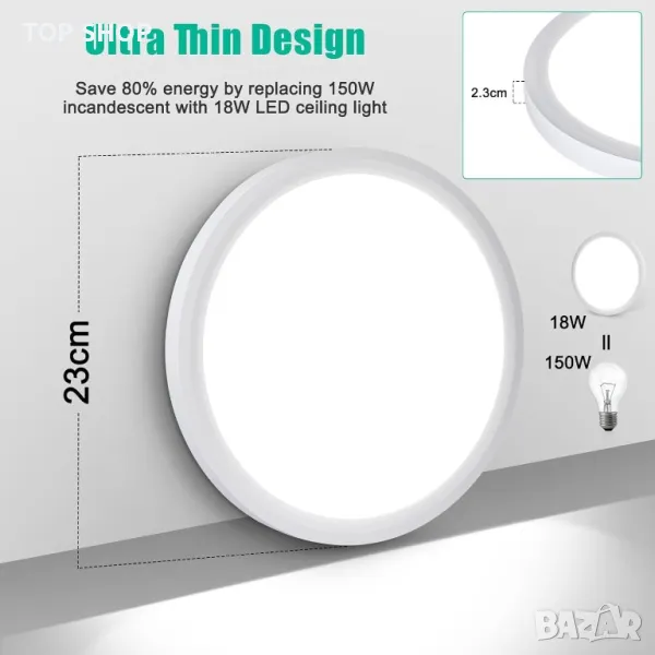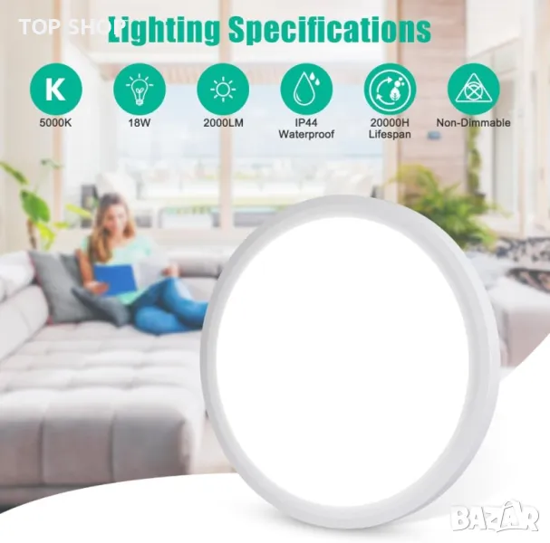Моля използвайте системата за съобщения! Просто изпратете запитване. По телефона се губи време за уточняването на търсения от Вас продукт.Тази 18W LED таванна лампа е високоефективен заместител на 150W лампа с нажежаема жичка, като предлага повече от 80% икономия на електроенергия и може да се похвали с продължителност на живота до 20 000 часа. Осигурява ярка светлина от 5000K без трептене или резки отблясъци, подходяща за чувствителни очи и влажни среди с водоустойчивото си уплътнение. Изработена от издръжлив ABS материал, който е устойчив на избледняване, ръжда и корозия, лампата разполага с ултратънък 2,3 см профил с прахоустойчива и лесна за почистване повърхност. Монтажът е лесен, с осигурени всички необходими приспособления, а модерният кръгъл дизайн го прави универсален за различни пространства като всекидневни, бани, кухни и др.