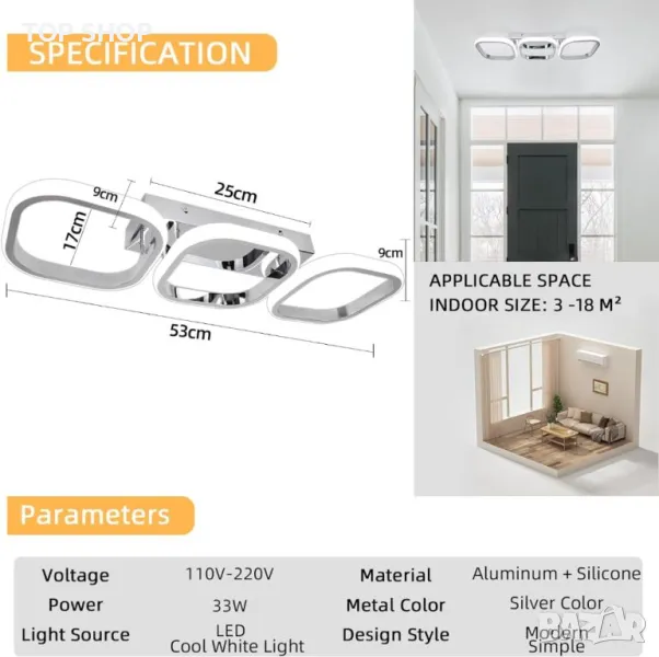 осветителни тела за плосък покрив. Той е по-ярък и подходящ за различни настройки, осигурявайки вечен стил. Спецификациите включват размер L53*W17*H9cm, 220V напрежение, 33W мощност, 2760lm яркост. Изработен от хромиран алуминий и акрил, той е антикорозионен, против избледняване, устойчив на надраскване и има живот от 40 000 часа. Висококачествените LED чипове осигуряват енергоспестяващо осветление без трептене, предпазващо очите, без инфрачервени или ултравиолетови лъчи. Лесен за инсталиране, той подобрява коридорите, всекидневните, кухните, трапезариите, спалните, хотелите, стълбищата и входовете, добавяйки стилна и очарователна атмосфера към всеки интериор.
