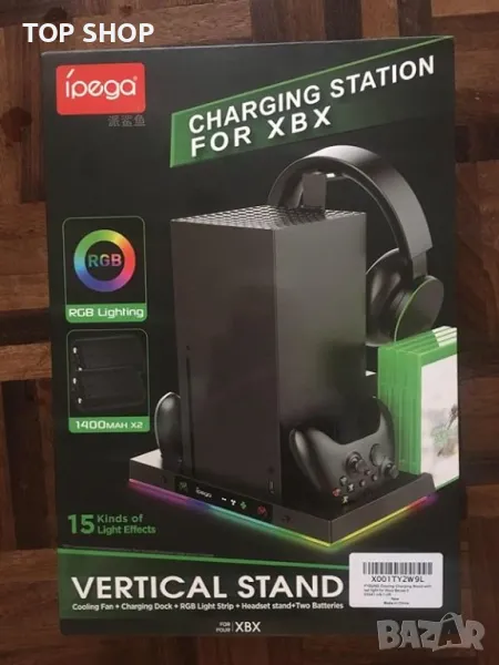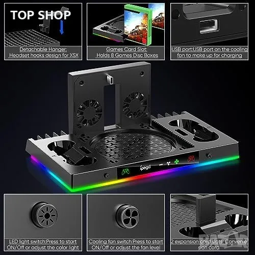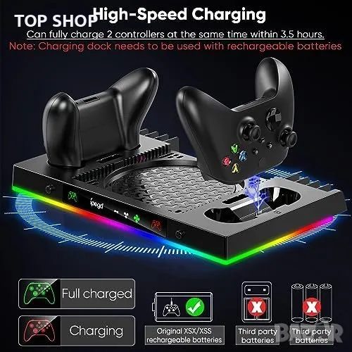 Xbox Series X, тази стойка съчетава охлаждане, зареждане на два контролера, монтаж на слушалки и съхранение на карти за игри. Тя включва 2 акумулаторни батерии с капацитет 1400 mAh.