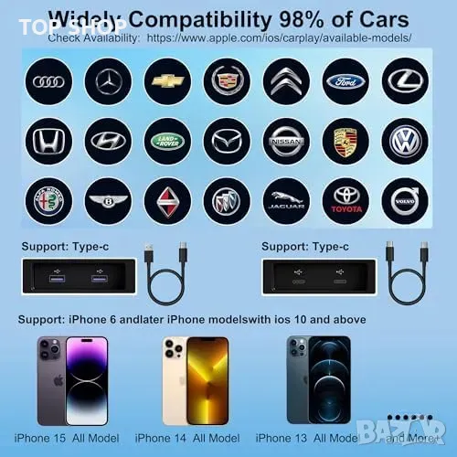 Поддържа iPhone с iOS 10+ и автомобили с фабричен кабелен CarPlay (2016+)