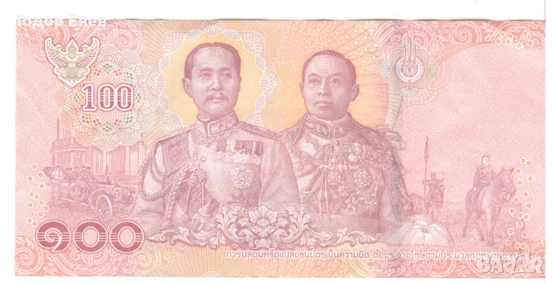 Half-length figure of King Rama V and King rama VI, both front-facing but have eyesight toward the center. Rava V's royal trip to Notodden, Norway, on a car driven by Sam Eyde to the lower left of Rama V. King Rama VI riding horse, founding of Thai Boy Scouts to the lower right of King Rama VI. Trishula trident in Chakra on guillochés background, to the upper right of King Rama VI. Arabic numerals denomination on guillochés background, on upper-left; Thai numerals denomination on bottom-left corner.