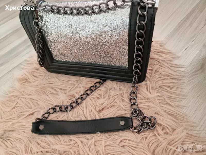 Елегантна/вечерена чантичка, среден размер със сребрист брукат. Дълга, регулираща се дръжка. Ползвана по поводи. Символични цени на всички дрешки в профила ми. Опция тест и преглед. Доставка с отстъпка до офис ЕКОНТ,0899243418