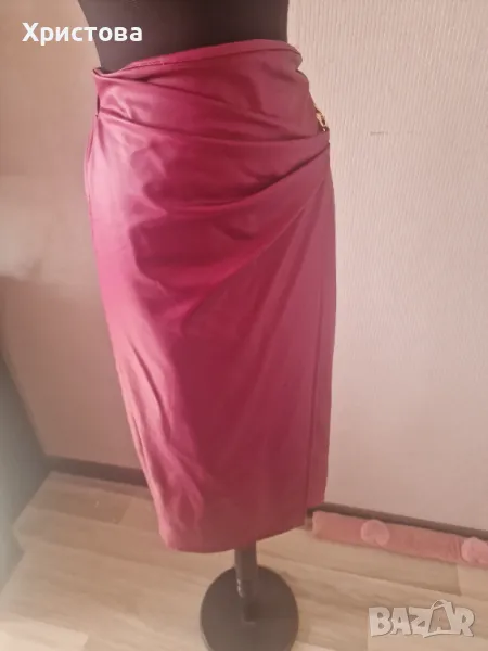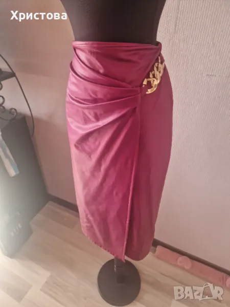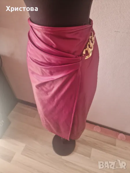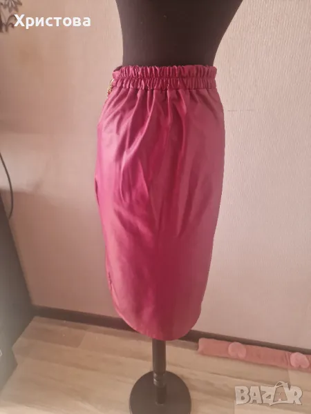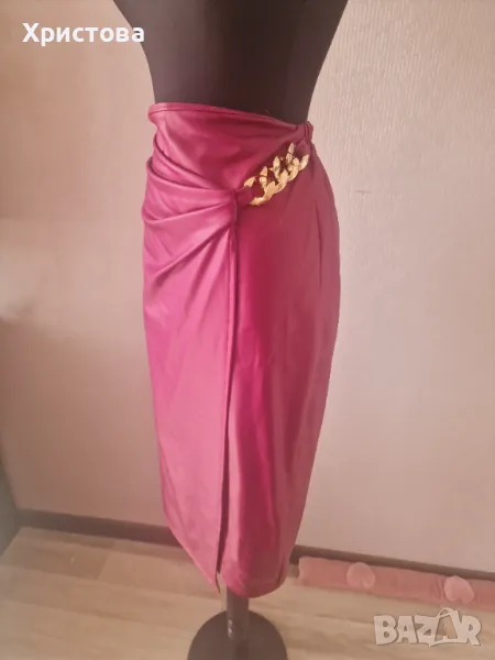 Пола в цикламено от сатенирана материя с еластан. Миди дължина под коленете. Кройка молив с много висока талия и ластик на колана. Синжирчето е пришито към нея. За дама С, М размер. Символични цени на всички дрешки в профила ми. Опция тест и преглед. Доставка с отстъпка до офис ЕКОНТ, 0899243418