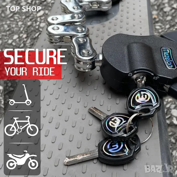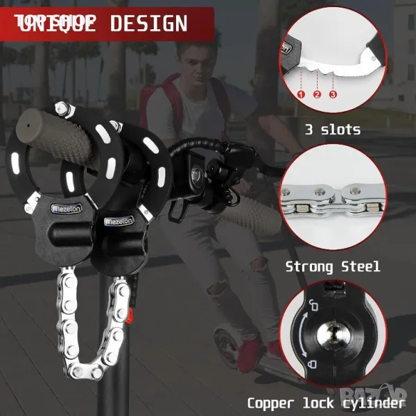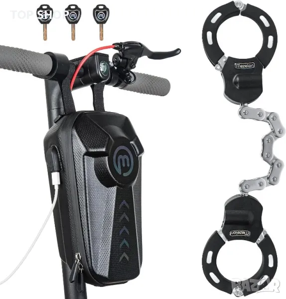 Чанта за заключване и съхранение - Идеалното допълнение към вашия скутер. Бравата Mezelon предлага несравнима сигурност със силна устойчивост на удар и порязване. Меките силиконови маншети предпазват от надраскване. Голяма 3L чанта за съхранение, водоустойчива и устойчива на абразия. Уникален дизайн на ключалка с двоен пръстен за лесна употреба.