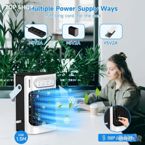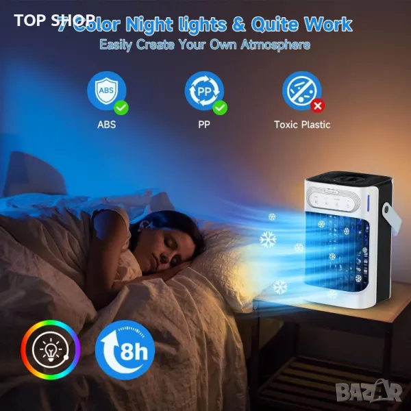 Изпитайте революционно охлаждане с усъвършенстван въздушен охладител с изпарение, включващ технология за водопад тип пчелна пита, която незабавно понижава температурите до 7-10 градуса с помощта на ледена вода. Тази система предлага по-здравословна алтернатива на традиционния климатик, като имитира естествения вятър и поддържа нивата на влага. Персонализирайте охлаждането си с 3 режима на скорост и 3 опции за вятър, допълнени от двойни ултразвукови пулверизатори за бързо производство на охлаждаща мъгла. Контролирайте посоката с регулируеми щори и се насладете на непрекъсната работа с резервоар за вода от 800 ml, издържащ до 8 часа. Това енергийно ефективно устройство с мощност 10 W е универсално, поддържа множество източници на захранване, включително USB и захранващи банки, и се предлага с настройка за 4 таймера. Подобрете средата си с вградена 7-цветна нощна лампа, което я прави идеална за различни вътрешни и външни настройки. Лек и преносим, той е идеален избор за домове, офиси и къмпинг.