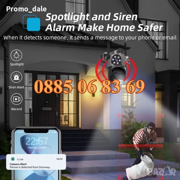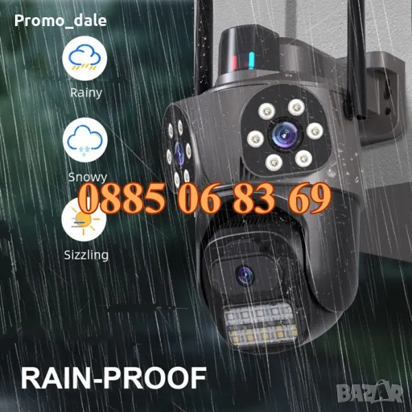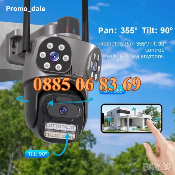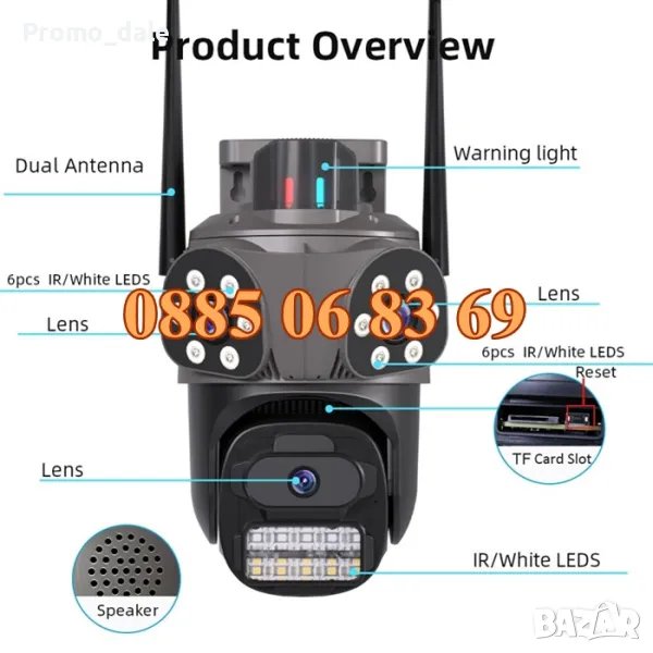 Нов модел иновативна двойна външна WiFi камера с Ultra HD резолюция. Три камери в един корпус: Стационарни и ротационна (въртяща се). 10 Mpx резолюция и за трите обектива. Auto tracking функция за хоризонтално проследяване на движение от ротационната камера. Вграден високочувствителен цифров микрофон за аудио мониторинг и говорител за двупосочна аудио връзка. High Power LED осветители за цветно нощно виждане до 30 метра. Функция за хоризонтално и веетикално проследяване на движението на ротационната камера. Слод за micro SD карта до 128GB. Безплатно мобилно приложение за iPhone и Android - ICSee, XMeye, XMEye Pro за отдалечено наблюдение в реално време и преглед на записите. Завъртане от мобилен телефон по хоризонтала на 270° и по вертикала на 90°. Широкоъгълни обетиви с фокусно разстояние 3.6мм на трите камери, с хоризонтален ъгъл на сцената 90° на стационарните и 120° на въртящата се камера. Функционална стойка даваща възможност за лесен монтаж на таван или стена. Камерата разполага с три нощни режима на работа: Цветен нощен режим, черно-бял нощен режим и цветен нощен режим при движение.