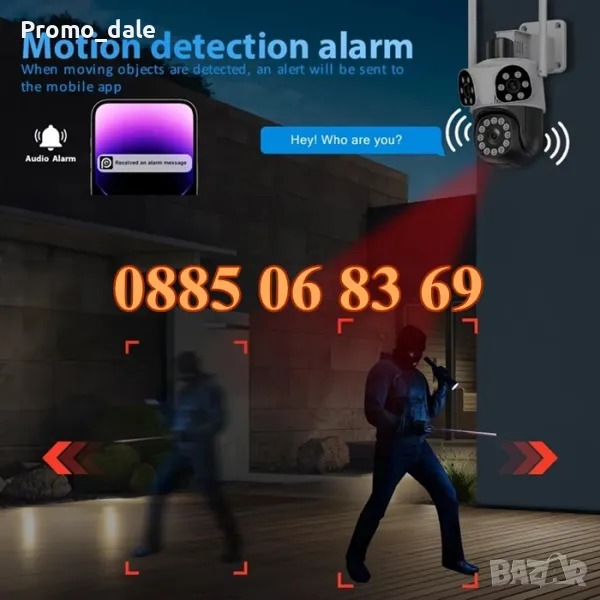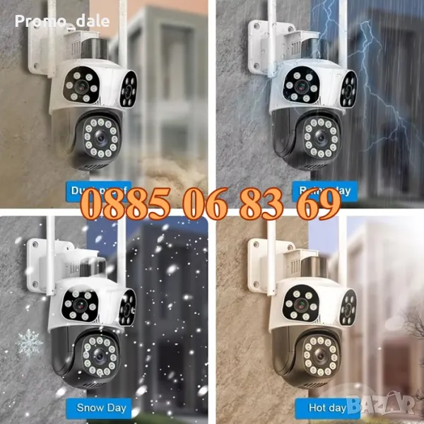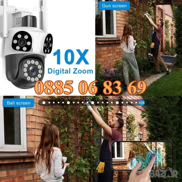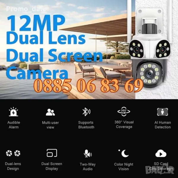 Нов модел иновативна двойна външна WiFi камера с Ultra HD резолюция. Три камери в един корпус: Стационарни и ротационна (въртяща се). 12 Mpx резолюция и за трите обектива. 10X зуум увеличение. Auto tracking функция за хоризонтално проследяване на движение от ротационната камера. Вграден високочувствителен цифров микрофон за аудио мониторинг и говорител за двупосочна аудио връзка. 24 броя High Power LED осветители за цветно нощно виждане до 30 метра. Функция за хоризонтално и вертикално проследяване на движението на ротационната камера. Слод за micro SD карта до 128GB. Безплатно мобилно приложение за iPhone и Android - ICSee, XMeye, XMEye Pro за отдалечено наблюдение в реално време и преглед на записите. Завъртане от мобилен телефон по хоризонтала на 270° и по вертикала на 90°. Широкоъгълни обетиви с фокусно разстояние 3.6мм на трите камери, с хоризонтален ъгъл на сцената 90° на стационарните и 120° на въртящата се камера. Функционална стойка даваща възможност за лесен монтаж на таван или стена. Камерата разполага с три нощни режима на работа: Цветен нощен режим, черно-бял нощен режим и цветен нощен режим при движение.