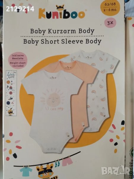 Комплекти с размер 62-68 и 86-92. Три бодита и два комплекта с по две блузки. Размерите се виждат и на кутиите от снимките. Цената е обща.