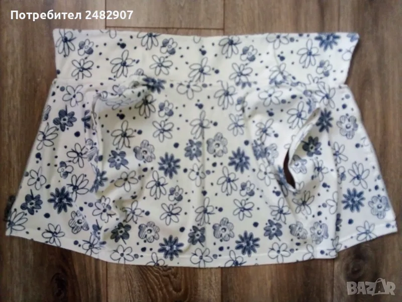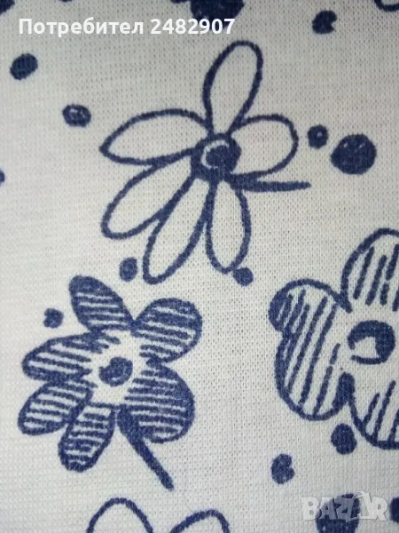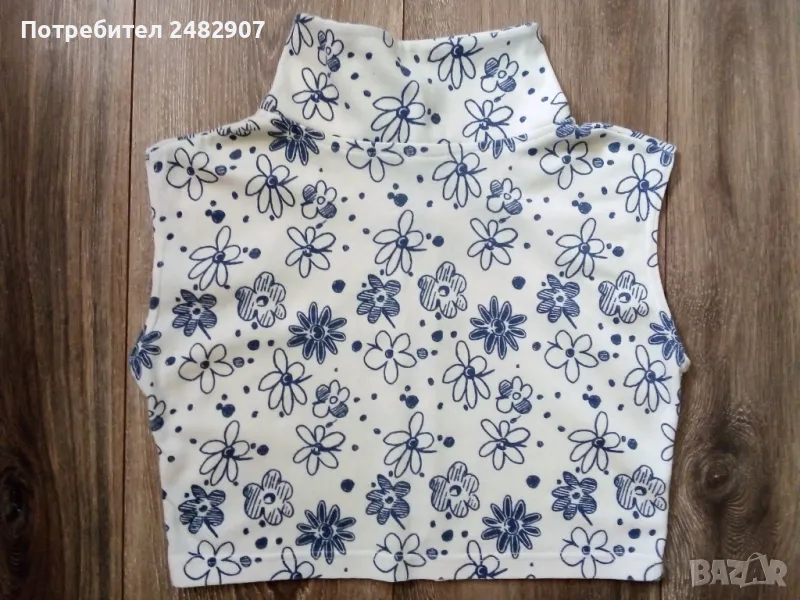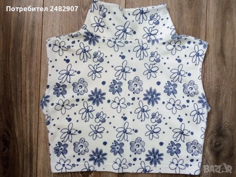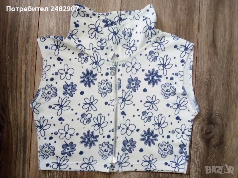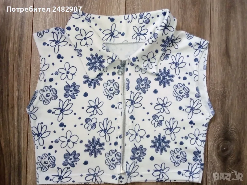 Къса дамска блуза с яка и цип в бяло и тъмно синьо, размер S. Ширина в раменете - 38 см, ширина под мишниците - 41 см, ширина в долната част - 35 см, дължина от рамото до долу - 34 см. Много запазена, почти не е използвана.