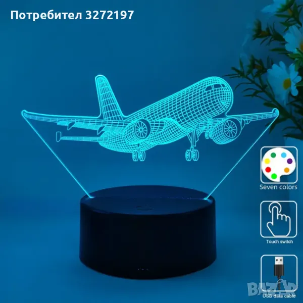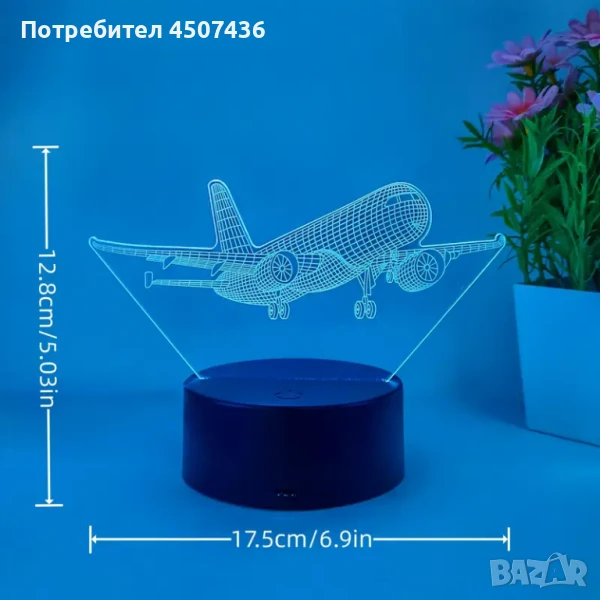 Холограмна 3D LED лампа Пътнически Самолет,RGB Седемцветен Интелигентен Контрол,USB
