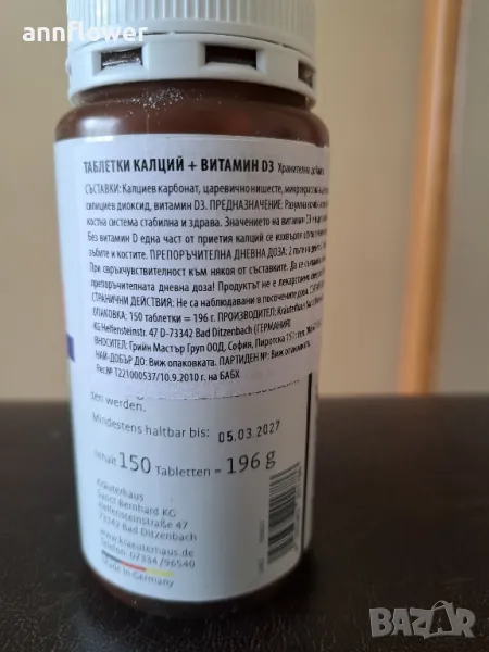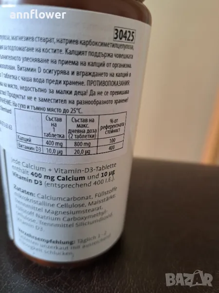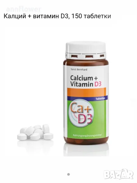 Опаковка: 150 таблетки за 75 дниМарка: Sanct BernhardКалций – минералът на дълголетието!Предотвратете остеопорозата. Заздравете костите!Разумна комбинация за подпомагане на костите. Калцият поддържа човешката костна система стабилна и здрава. Значението на витамин D3 е в допълнителното улесняване на усвояването на калций от организма. За здрави кости, зъби и венци.Състав:Всяка капсула съдържа: 400 mg калций и 10,0 µg витамин D3 (400 I.E.). Sanct Bernhard препоръчва за подпомагане при: остеопороза, болки в ставите, чупливост на ноктите, мускулни крампи (спазми), екземи, сърцебиене, безсъние, избухливост, нарушено храносмилане и киселини, при сърдечно-съдовизаболявания.Допълнително действие:Комбинацията калций и витамин D3 подпомага регулирането на кръвното налягане и пулса, нормалното кръвосъсирване, дейността на щитовидната жлеза, сърдечно-съдовата и храносмилателната системи.Начин на употреба: 2 пъти на ден по 1 таблетка с чаша вода преди хранене.Знаете ли, че...Три таблетки калций + витамин D3 съдържат толкова калций, колкото 1 литър прясно мляко! В таблетките на Sanct Bernhard калцият е в комбинация с витамин D3, тъй като само тогава калцият може да се усвои от червата. Без витамин D3 една част от приетия калций се изхвърля неизползван. Витамин D3 осигурява и вграждането на калций в зъбите и костите.През 2007 година таблетките калций+витамин D3 на Sanct Bernhard получават оценка “добър продукт” от асоциацията на потребителите ”ÖKO-TEST”.