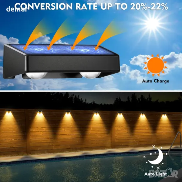 Соларните оградни светлини разполагат с двойна оптична леща за по-ярка, по-фокусирана светлина от 50 лумена, с високоефективни фотоволтаични панели, преобразуващи слънчевата светлина с 20% по-ефективно, за да спестят електроенергия. Предлага множество режими на осветление, включително топло бяло, студено бяло, различни плътни цветове и RGB ефекти за персонализирана атмосфера. Изработени от издръжливи, IP65 водоустойчиви материали, те издържат на дъжд и сняг, осигурявайки до 10 часа осветление, когато са напълно заредени. Лесен за инсталиране с включени винтове, не изисква окабеляване и идеален за огради, палуби, стени и стъпала. Оптималното разположение е около 1,8 м височина и 0,8-1 м разстояние, регулируемо въз основа на нуждите от осветление. Осигурете излагане на слънчева светлина за най-добро представяне.