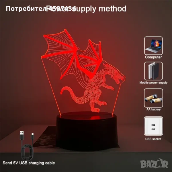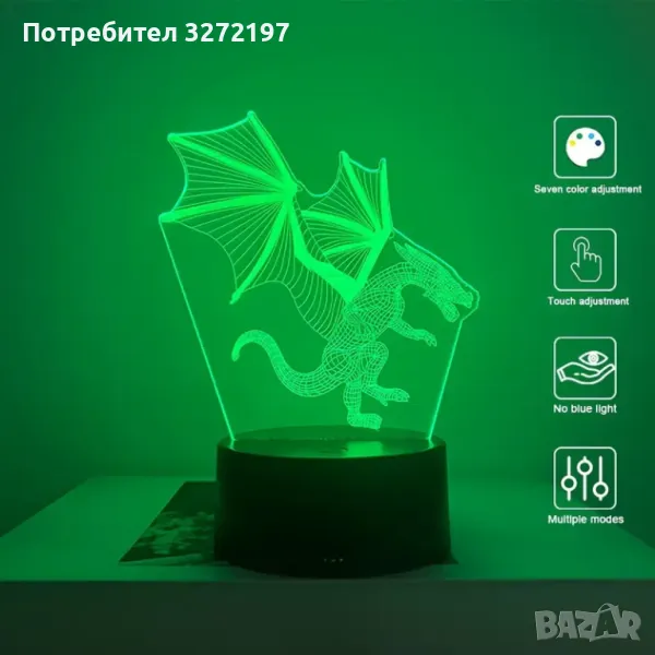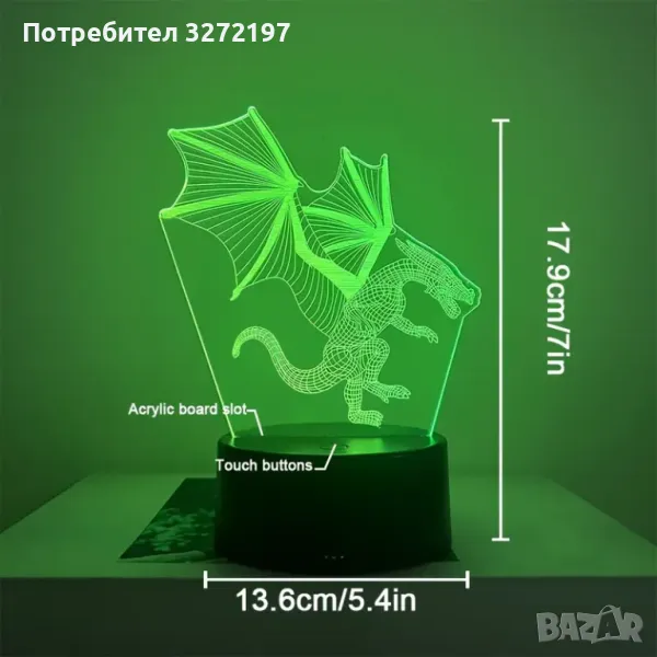 Холограмна 3D LED лампа Летящ Дракон,RGB Седемцветен Интелигентен Контрол,USB