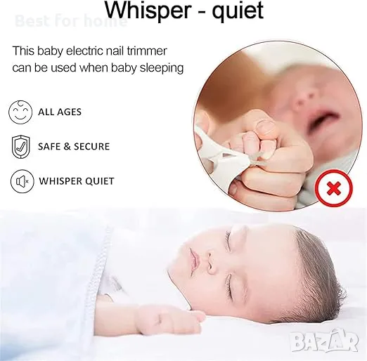 【Нисък шум】 Това е бебешкият електрически комплект за нокти, революционен продукт, който е проектиран да бъде изключително тих. Приема безшумен двигател, стабилна скорост, ниски вибрации, може да се използва за сън на бебето. Това ви позволява да подрязвате ноктите на вашето бебе, докато то спи. Което означава, че вече не е нужно да ги будите за сутрешния им сън!