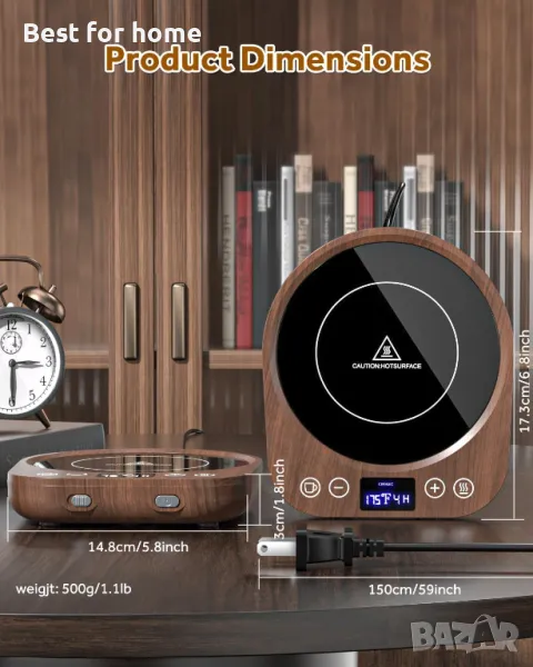 индукционен нагревател за чаши с 9 температурни настройки Интелигентен нагревател за чаши с 4H автоматично изключване и 1-9 часов таймер за дома и офиса(дърво.)