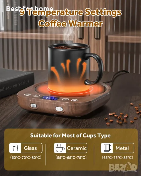 Интелигентен нагревател за кафе с 9 температурни настройки: Нашият нагревател за чаши за кафе за бюро има 9 регулируеми температурни настройки и избор от 3 типа чаши (керамика,стъкло, метал)