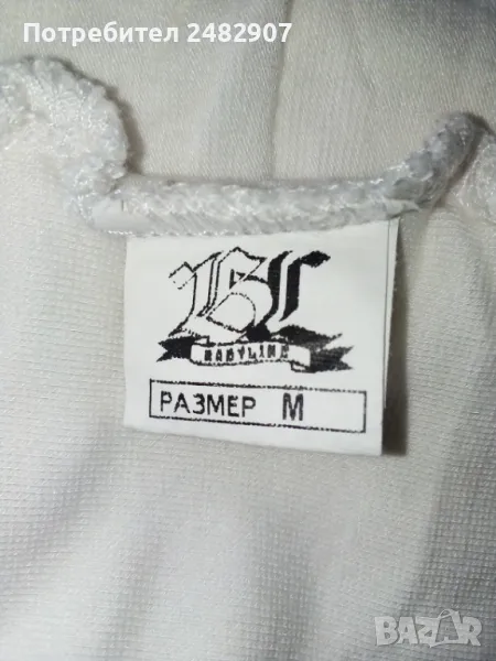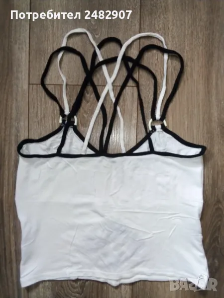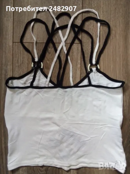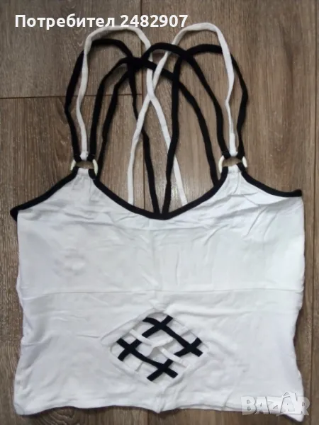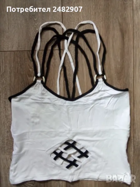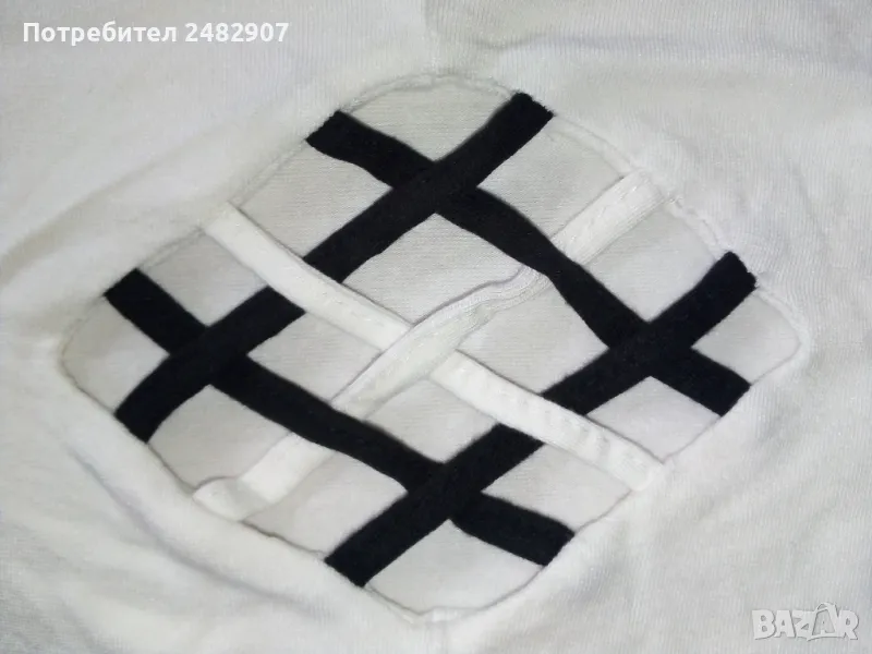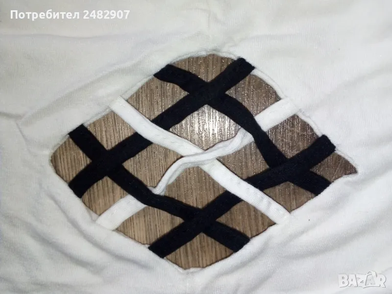 Ефектен дамски потник в бяло и черно, размер М. Съдържа 100 % вискоза. Ширина под мишниците - 35 см, ширина в долната част - 36 см, дължина от горната част на презрамките до долу - 47 см. Много запазен, почти не е използван.