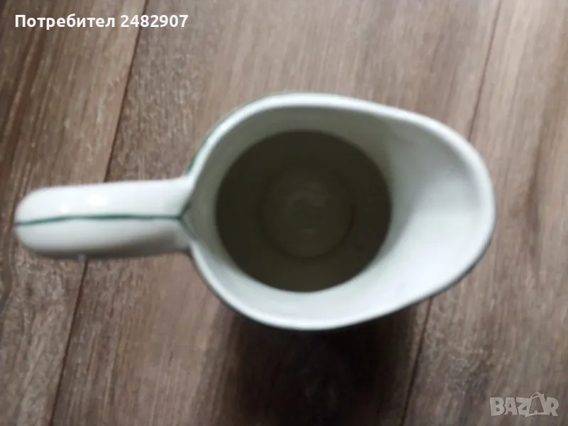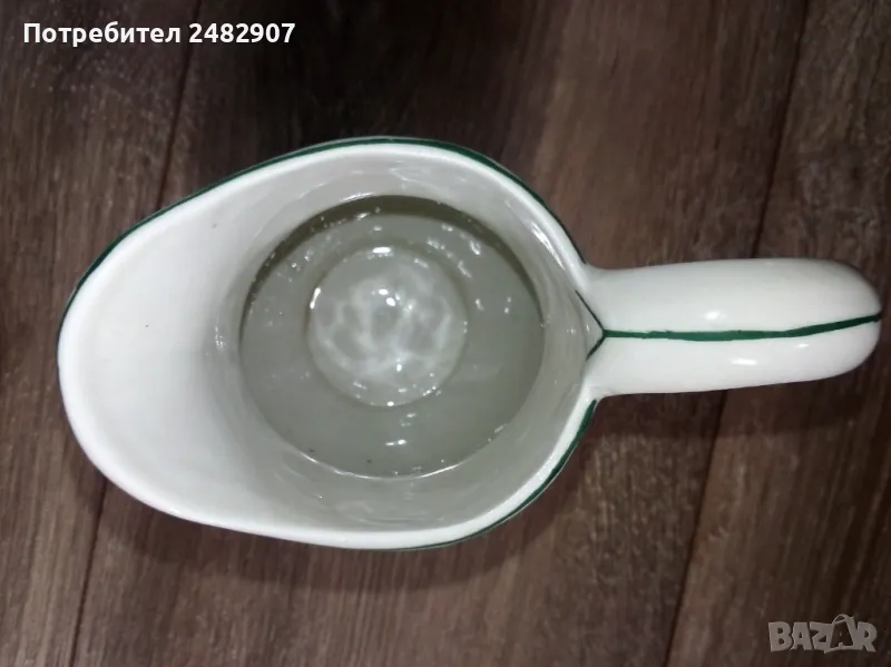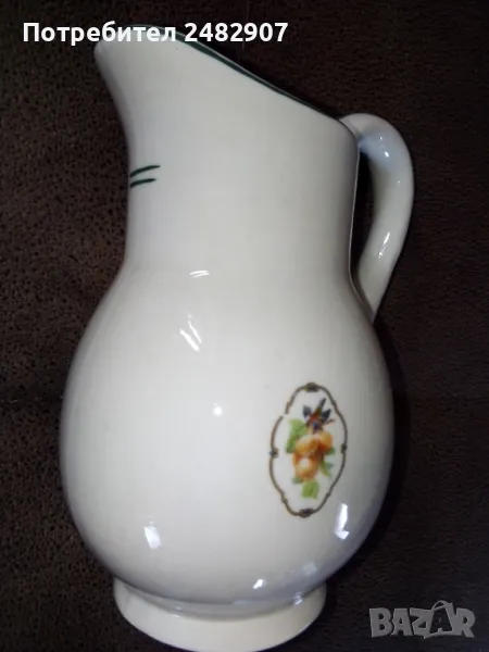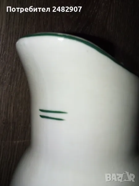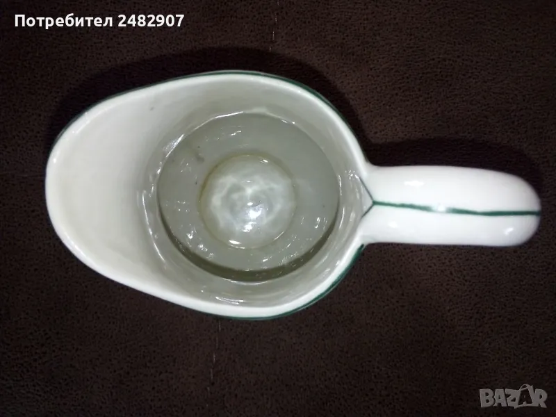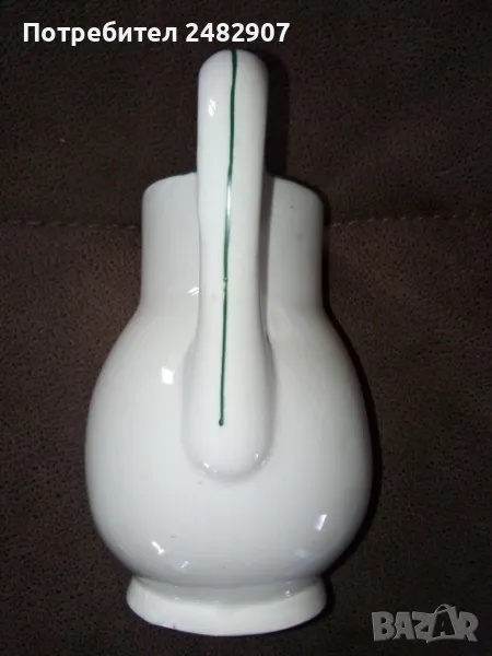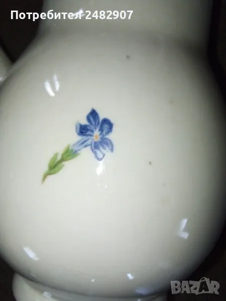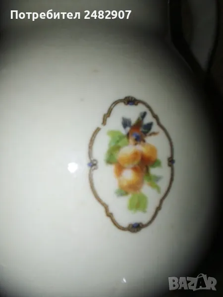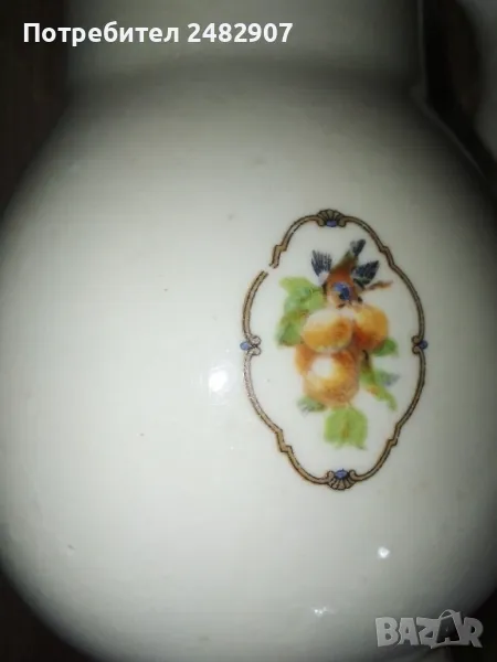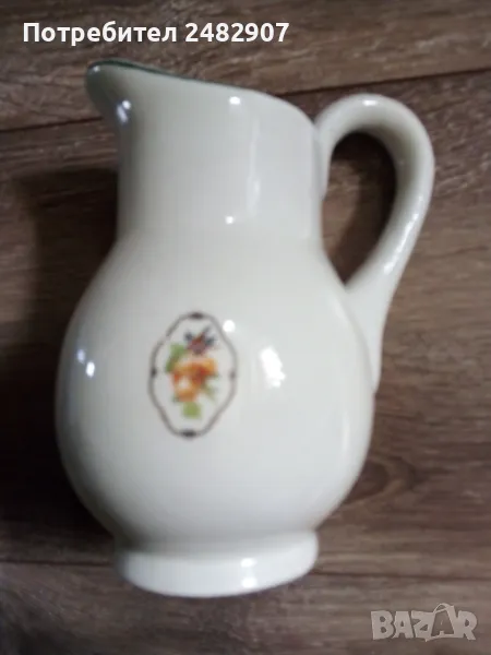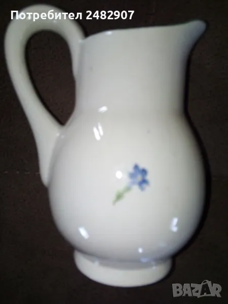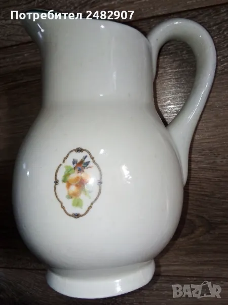 Стара порцеланова кана - ретро с красив дизайн. Диаметър в долната част - 6 см, ширина в горната част (от улея до дръжката) - 11 см, височина - около 16 см. Много запазена, почти не е използвана, без забележки. Подходяща за декорация, колекция, подарък или употреба.