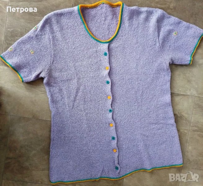 Дамска блуза с къс ръкав, букле, бутикова, вълнена материя, нежен лилав цвят, с декоративни жълти и зелени копчета до долу, каквито са цветовете около бието и ръкавите, в раменете 40 см, гр. об. 90 см, дължина на блузата 60 см, запазена, красива, със свежи цветове, цена 7 евро. Изпраща се с 10% намаление от общоприетата куриерска такса.
