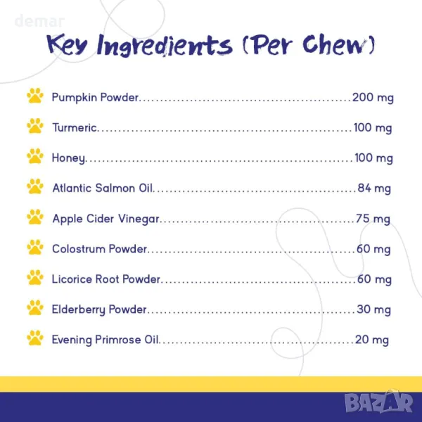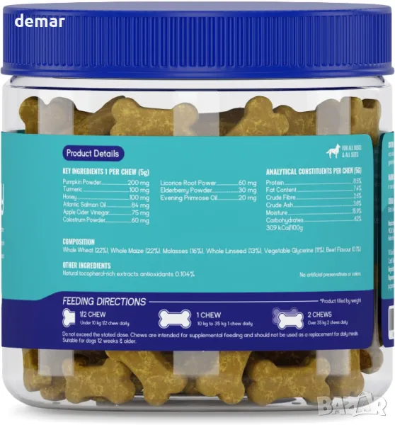 Подпомага кожата, козината, имунитета и храносмилането с куркума, ябълков оцет, коластра и масло от сьомга, помагайки за поддържане на здрава кожа, лъскава козина и нормална имунна и чревна функция. Омега-3 мастни киселини от масло от дива атлантическа сьомга насърчават здравето на сърцето, когнитивните функции и ставите. Тези вегетариански дъвчащи дъвки с вкус на говеждо месо са тествани на вкус за всички породи, гарантирайки вкус, който кучетата харесват. Направен със съставки без ГМО, без изкуствени консерванти и оцветители, за безопасно и здравословно лечение.