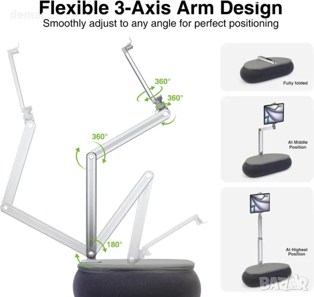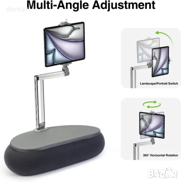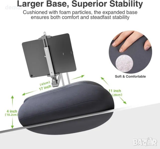 Тази 66 см висока стойка за таблет елиминира нуждата от подреждане на възглавници, осигурявайки ергономично изживяване при гледане на нивото на очите за различни позиции. Неговата разширена основа на чувала, пълна с първокласни полистиренови перли, предлага стабилна, но мека основа върху легла, дивани и неравни повърхности. Съвместим с 6-13" устройства, той също така служи като плот за лаптопи, скициране или леки закуски. Регулируемите рамена от алуминиева сплав и трите точки на завъртане позволяват въртене на 180° и 360° за оптимално гледане в портретен или пейзажен режим. Покрит с почистваща се изкуствена кожа с подвижно покритие с цип, той осигурява издръжливост и лесна поддръжка. Идеален за четене, сърфиране или гледане, той се адаптира без усилие към всяка настройка, повишавайки комфорта и удобството.