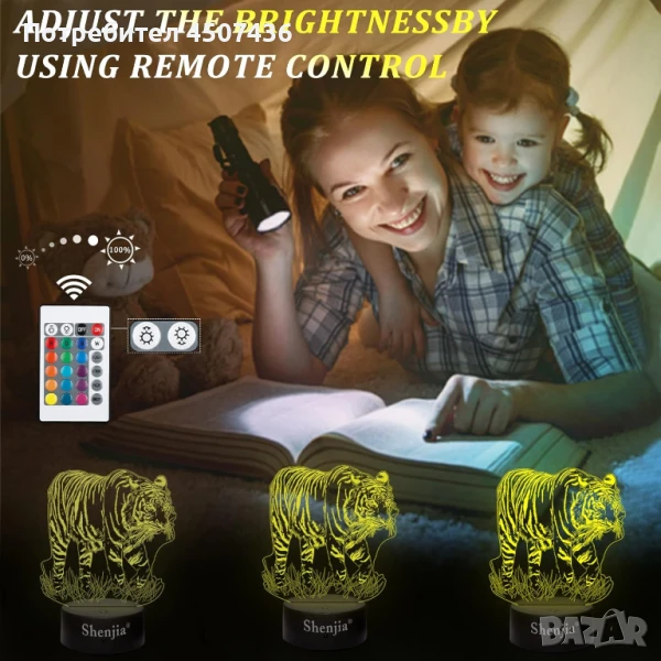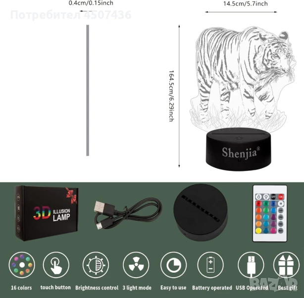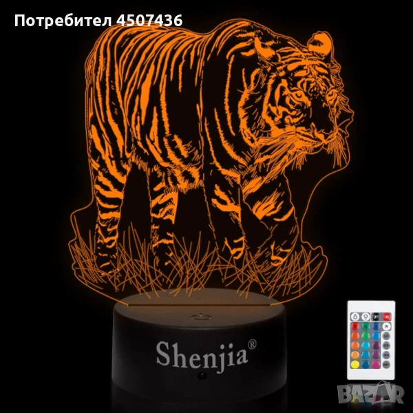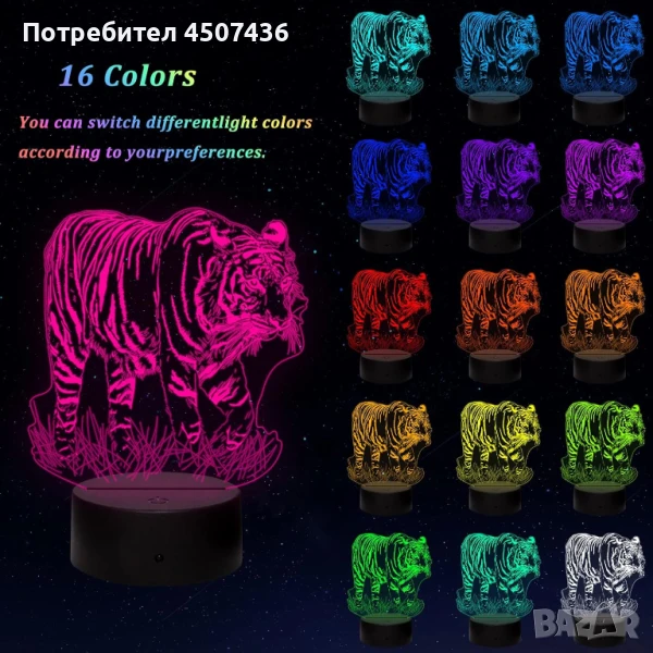 Холограмна 3D LED лампа Тигър-дистанционно управление 16 цвята+други режими на управление