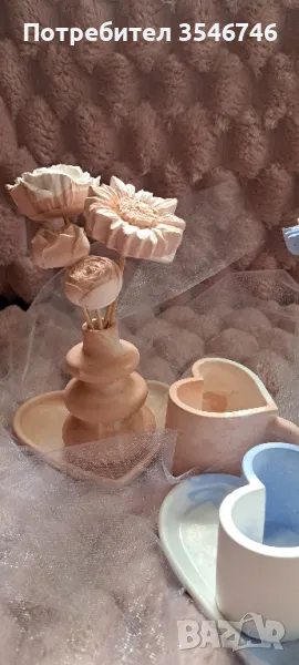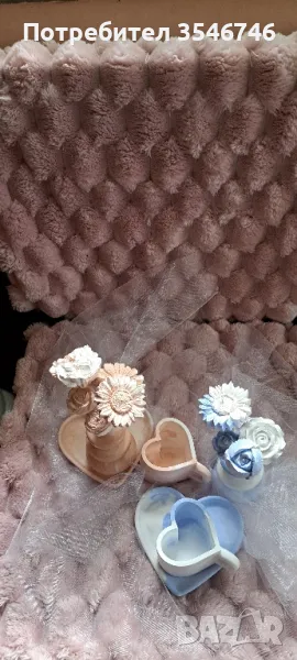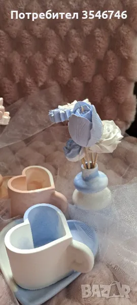 Здравейте! Показвам Ви новите неща, които изработих. Подложка във форма на сърце,чашка във форма на сърце и малка сладурска вазичка с цветя. Всичко е изработено от гипсо керамична смес. Има възможност цветята да бъдат изработени и от глицеринов сапун или соев восък. Чашката също може да бъде със соев восък. Всичко това е по ваш избор. Ароматите, които използвам са :Кокос и ванилия, Манго, Боровинка, Сандалово дърво, Жасмин, Роза, Лавандула, Черешов цвят, Бял чай, Коледни бисквитки. За сега това е от мен. Цената на този комплект е 18 лв