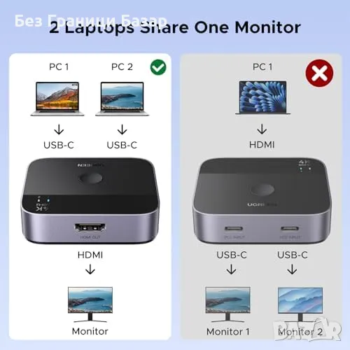 Нов UGREEN Превключвател USB-C 4K | 2 лаптопа 1 монитор | HDMI адаптер